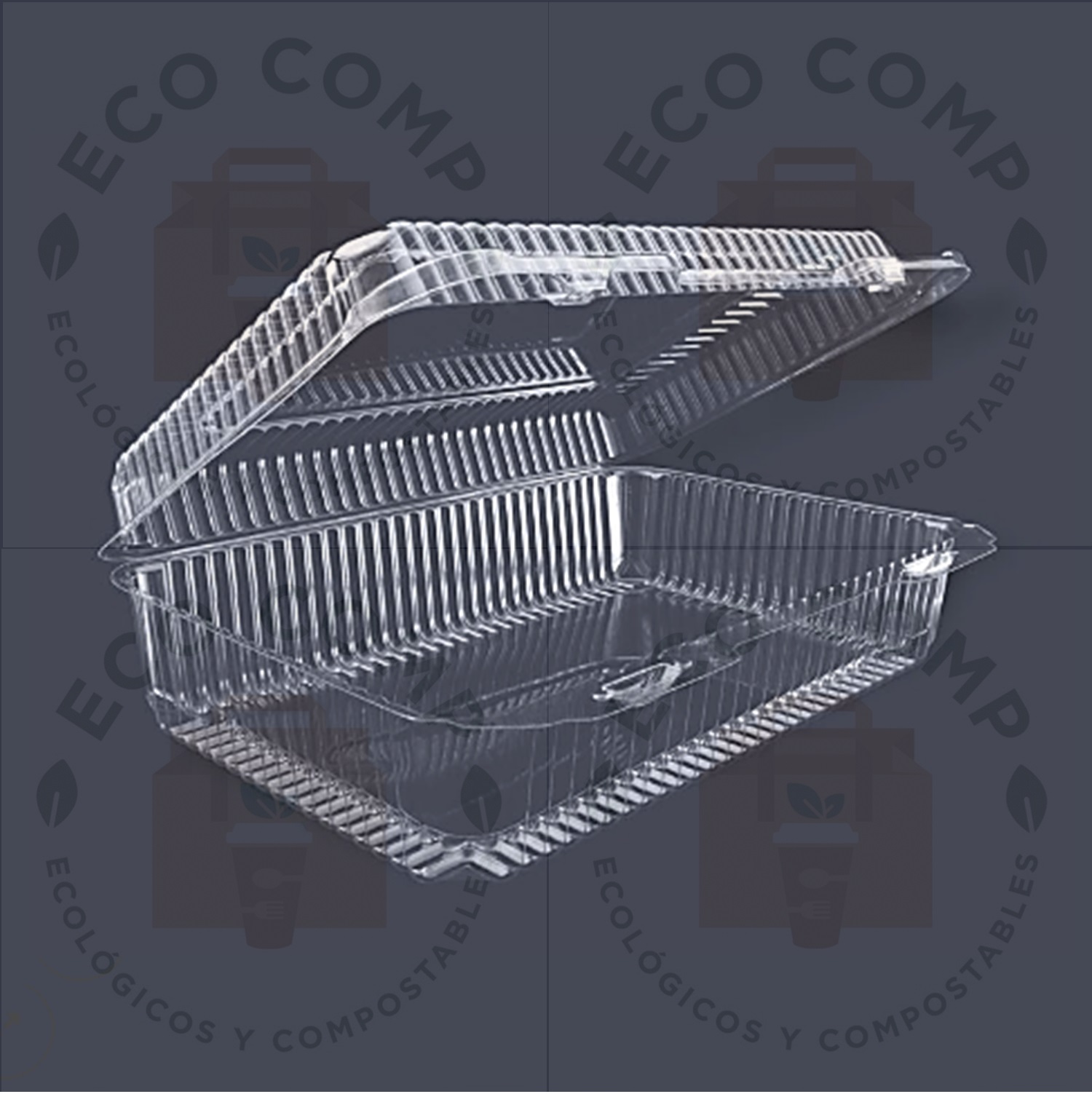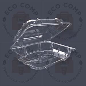 - Contenedor de plástico transparente, diseño tipo bisagra.